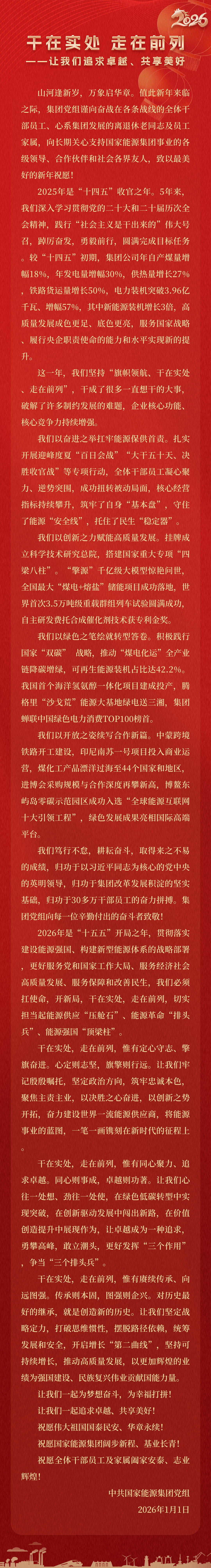 國家能源集團胸懷“國之大者”,增產(chǎn)增供、穩(wěn)價穩(wěn)市,積極服從服務(wù)國家戰(zhàn)略、保障國家能源安全、助力國民經(jīng)濟穩(wěn)增長,推動煤炭安全綠色智能、煤電清潔高效穩(wěn)定、現(xiàn)代煤化工高端多元低碳、運輸物流協(xié)同一體、新能源多元創(chuàng)新規(guī)模化發(fā)展,全力擔(dān)當(dāng)能源強國頂梁柱,能源供應(yīng)壓艙石,能源革命排頭兵。
